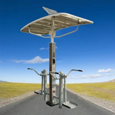 器材采用优良的钢材,器材顶部为防雨伞棚,顶棚材质为铝塑板,太阳能板电池采用多晶硅太阳能电池板,一次性充满可使用70小时,固定显示屏显示,在运动过程中实时记录并显示运动时间,运动次数,运动频率、消耗卡路里等运动数据。器材整体静电喷塑。